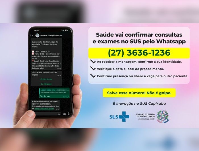 Os pacientes do Sistema Único de Saúde (SUS) do Espírito Santo vão confirmar a presença em consultas e exames por mensagem no WhatsApp (27) 3636-1236 do Governo do Estado. De qualquer lugar, eles vão poder desmarcar ou confirmar procedimentos médicos, sem precisar ir à unidade básica de saúde, poupando tempo e deslocamentos.