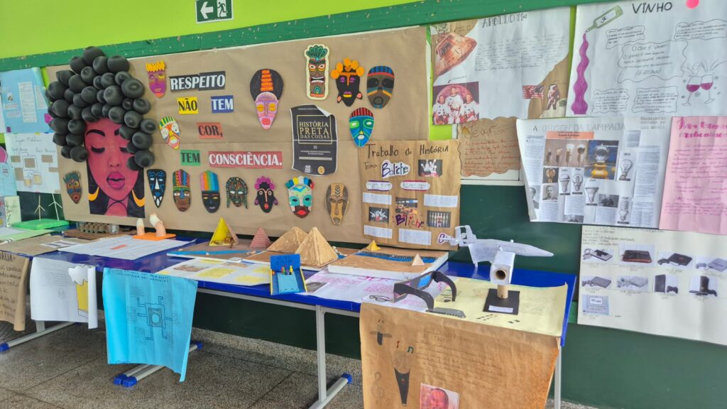 A feira também contou com um desfile que homenageou alunos negros e indígenas, uma apresentação musical encantadora organizada pela professora Márcia Arzamendia do Nascimento e uma peça teatral inovadora que simulou uma entrevista com Graciliano Ramos em inglês, coordenada pela professora Lilianne Baldan Porto Soares Azambuja. Para abrir as atividades, a professora Suelem Machado Rodrigues apresentou aos alunos a poesia “Vozes Mulheres”, de Conceição Evaristo.