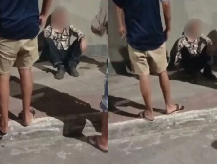 Ao chegar ao local, os policiais encontraram uma aglomeração em torno do suspeito, que estava sentado e apresentava escoriações. Em seguida, a equipe localizou a vítima e conversou com ela e com o avô.