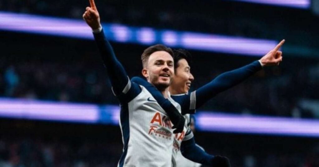 Foto: Divulgação/ Tottenham – Legenda: Maddison celebra o gol que deu a vitória ao Tottenham sobre o Manchester United neste domingo / Jogada10