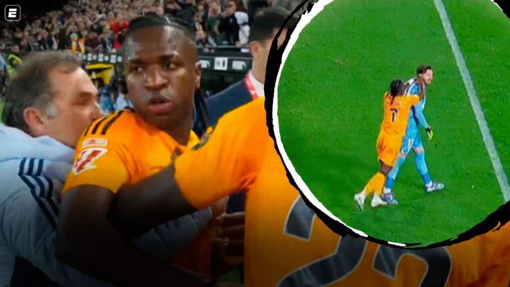 Após revisão do árbitro no VAR, Vini Jr. foi advertido com o cartão vermelho por conta da agressão e foi mais cedo para o vestiário. O brasileiro ficou revoltado com a decisão da arbitragem e reclamou bastante ainda em campo, inclusive, precisando ser contido pelos demais companheiros.